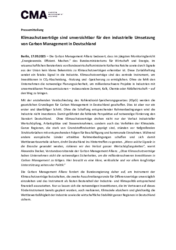 Berlin, 17.09.2025 – Die Carbon Management Allianz bedauert, dass im jüngsten Monitoringbericht „Energiewende. Effizient. Machen.“ des Bundesministeriums für Wirtschaft und Energie ...