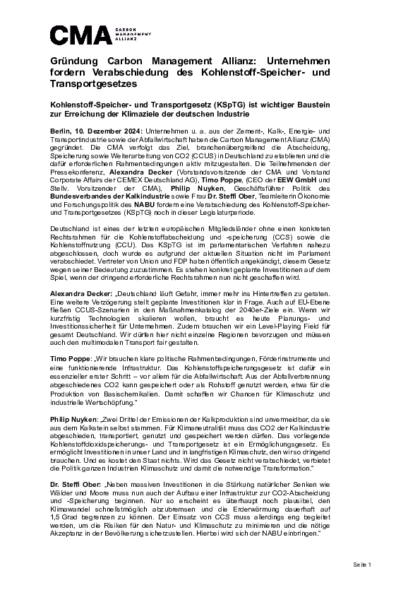 Die Carbon Management Allianz zum Bundeshaushaltsentwurf 2025