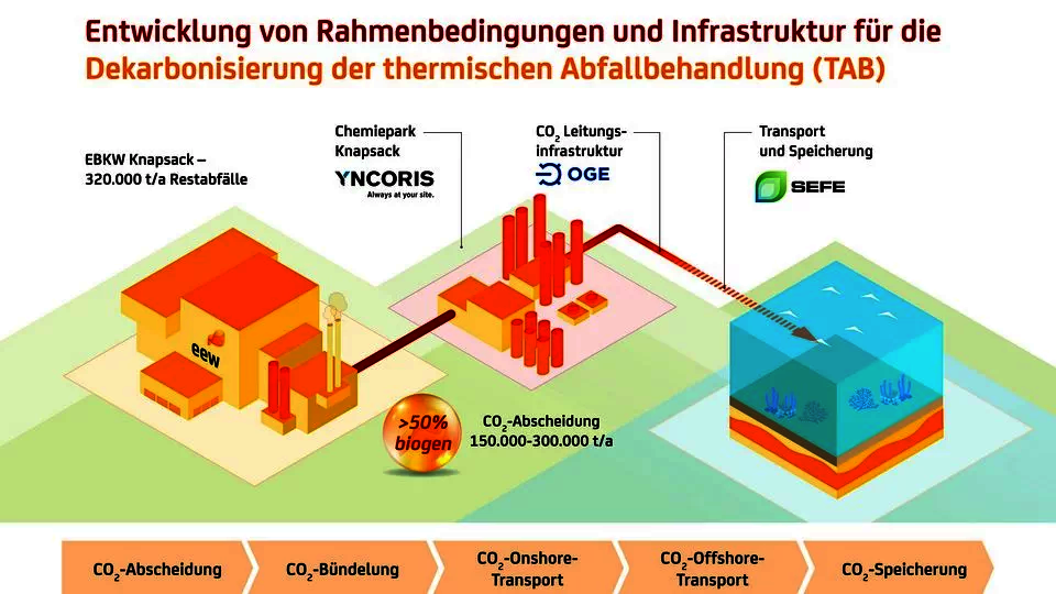 Am Ersatzbrennstoffkraftwerk (EBKW) im Chemiepark Knapsack in Nordrhein-Westfalen wird gemeinsam mit den Partnern entlang der Wertschöpfungskette eine CO₂-Abscheideanlage mit einer Kapazität von bis zu 300.000 Tonnen CO₂ pro Jahr geprüft. Das Projekt umfasst die Entwicklung der Abscheideanlage, den Transport des CO₂ über eine neue Pipeline-Infrastruktur sowie die sichere, dauerhafte Speicherung.